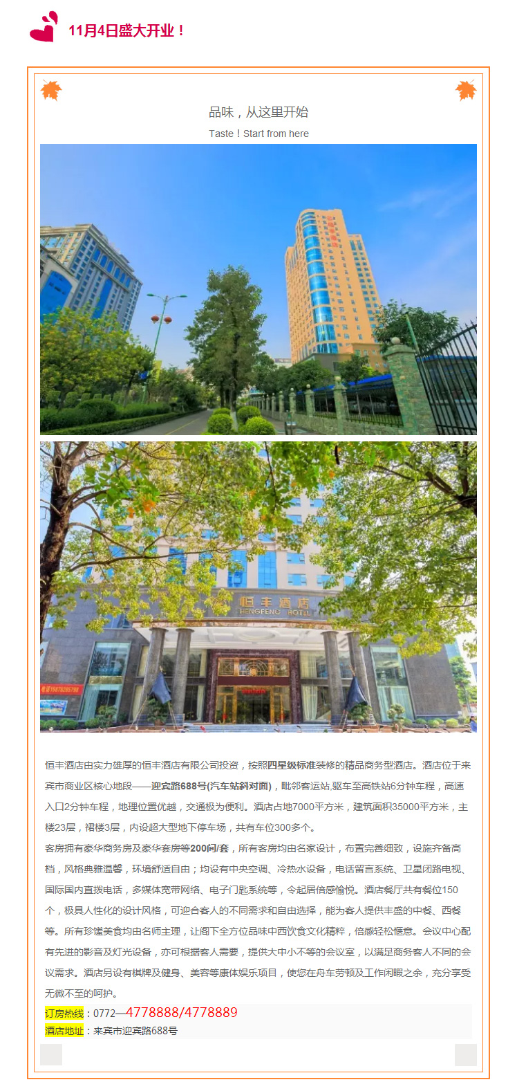 11月4日,來賓恒豐酒店盛大開業(yè),特價房98元,住就送!